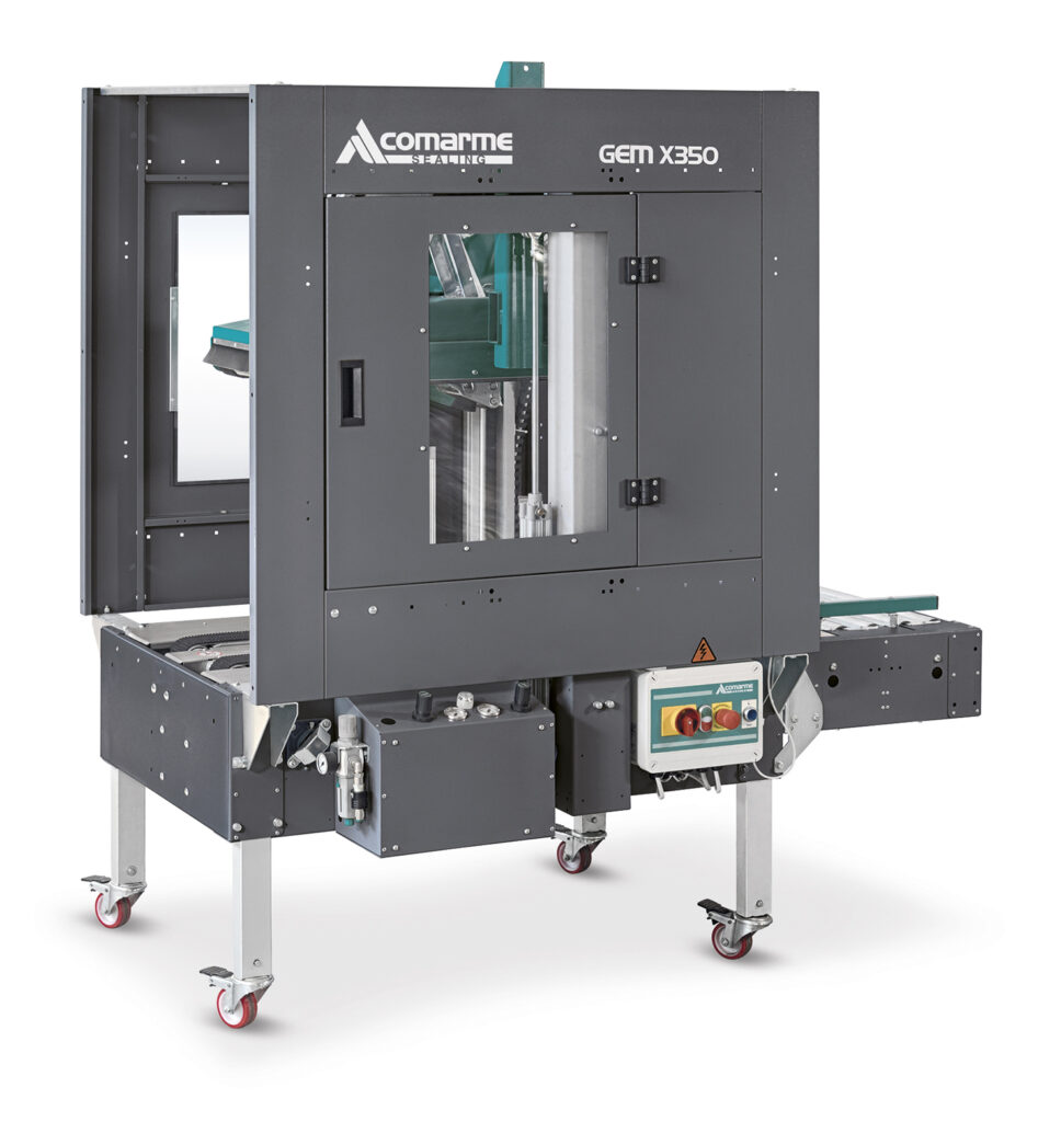 Semiautomatic taping machine which seals with adhesive tape the upper and lower parts of fixed-format boxes with manual adjustment. GEM 350 is especially suitable for sealing tall, narrow boxes as four belts, two upper and two lower ,horizontal and parallel to the work surface,are used for conveying. GEM 350 can also be used for irregularly shaped boxes.